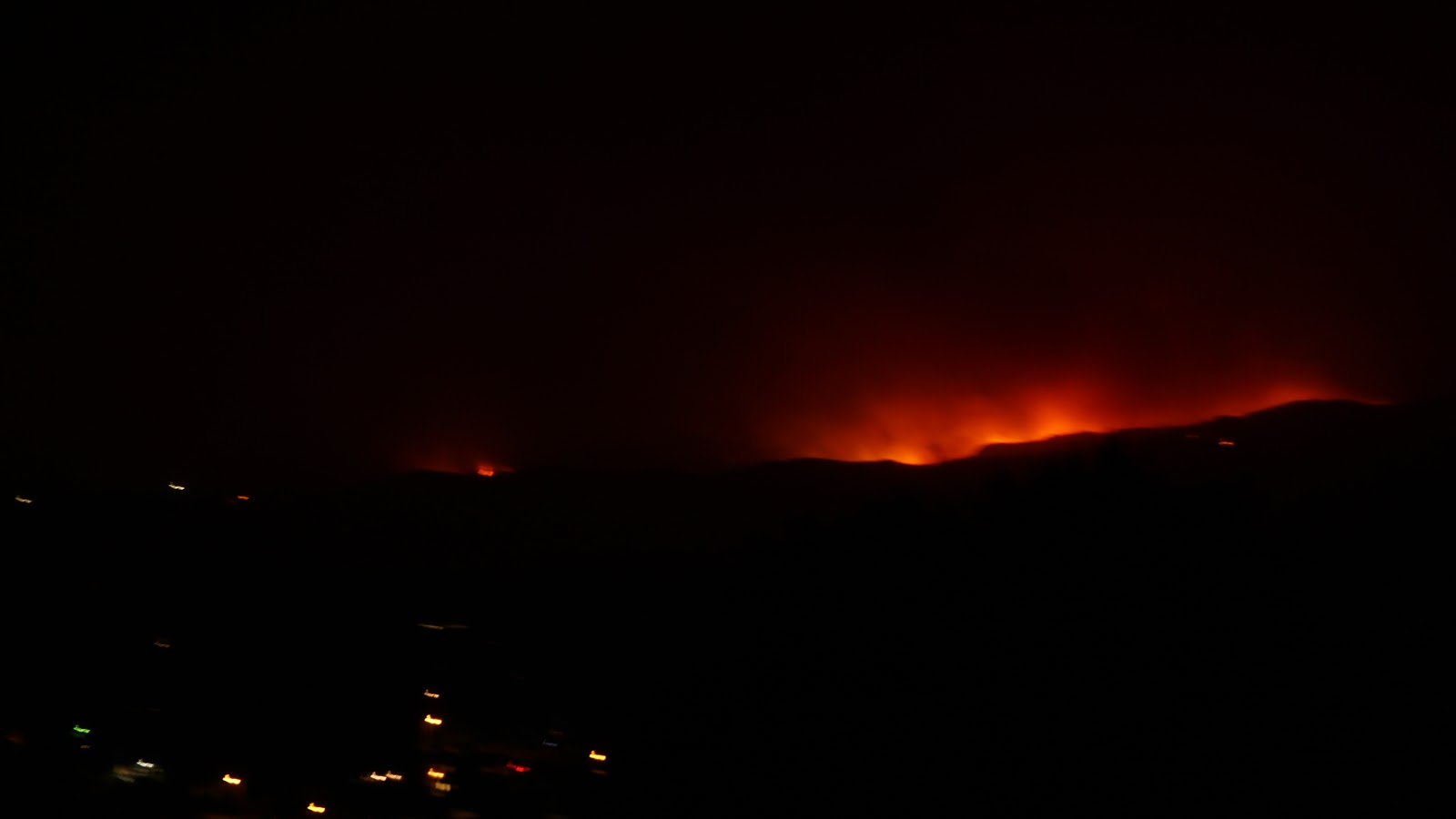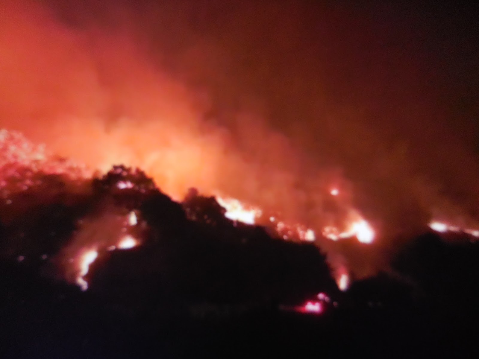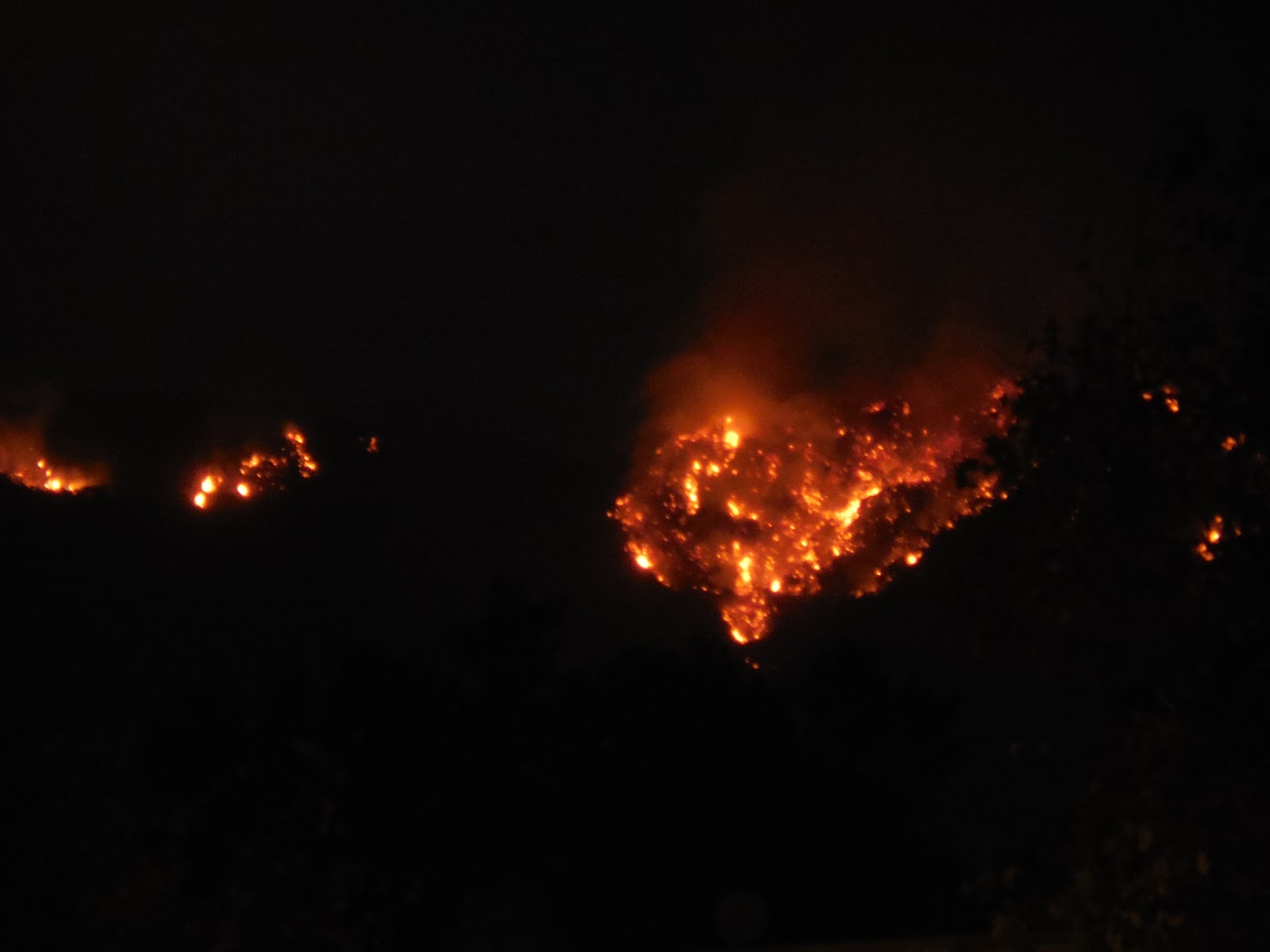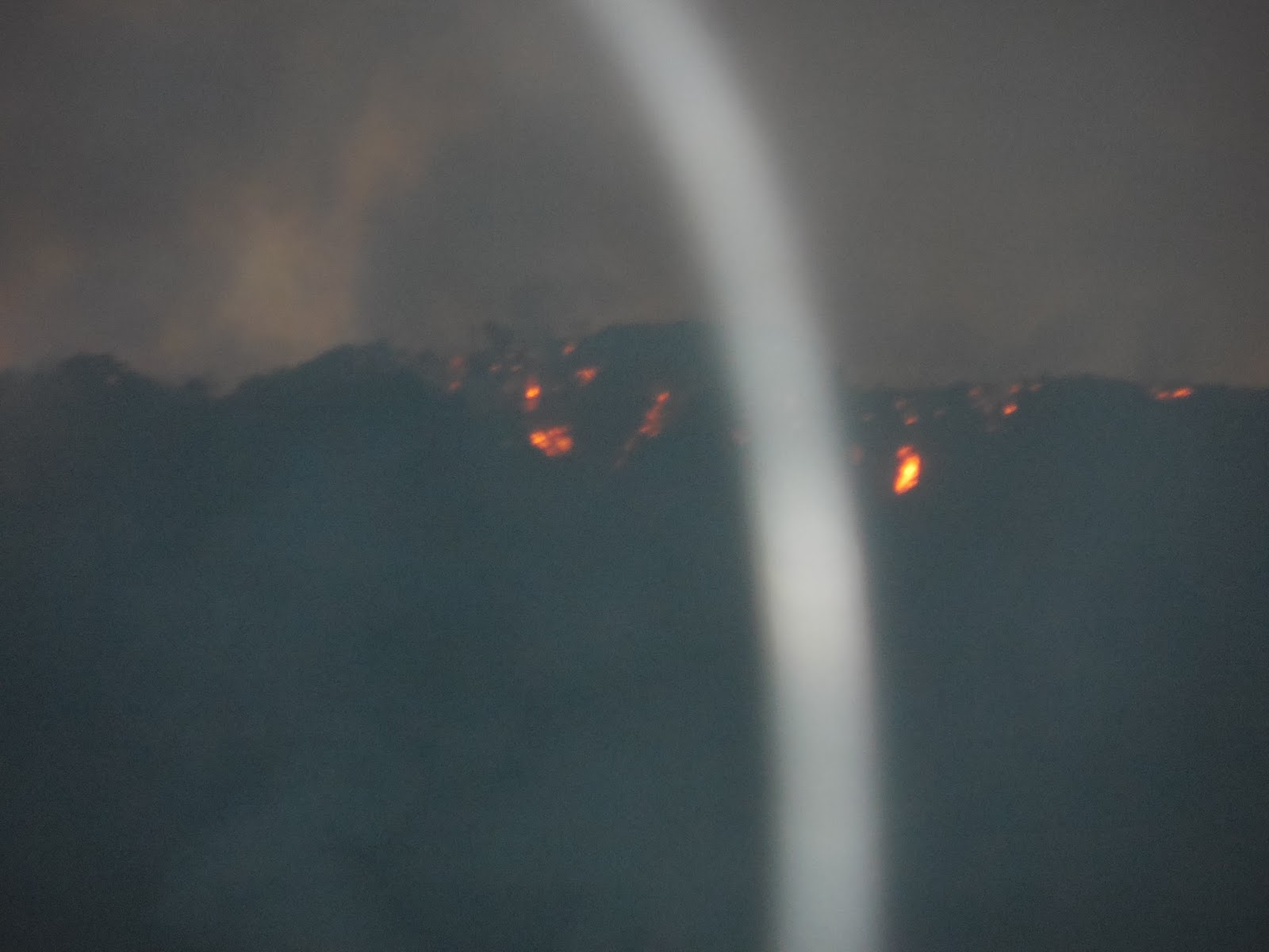 A wall of fire tonight 12 miles long, heading our way. Sorry for the shaky picture, shot it freehand in dense smoke. |