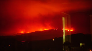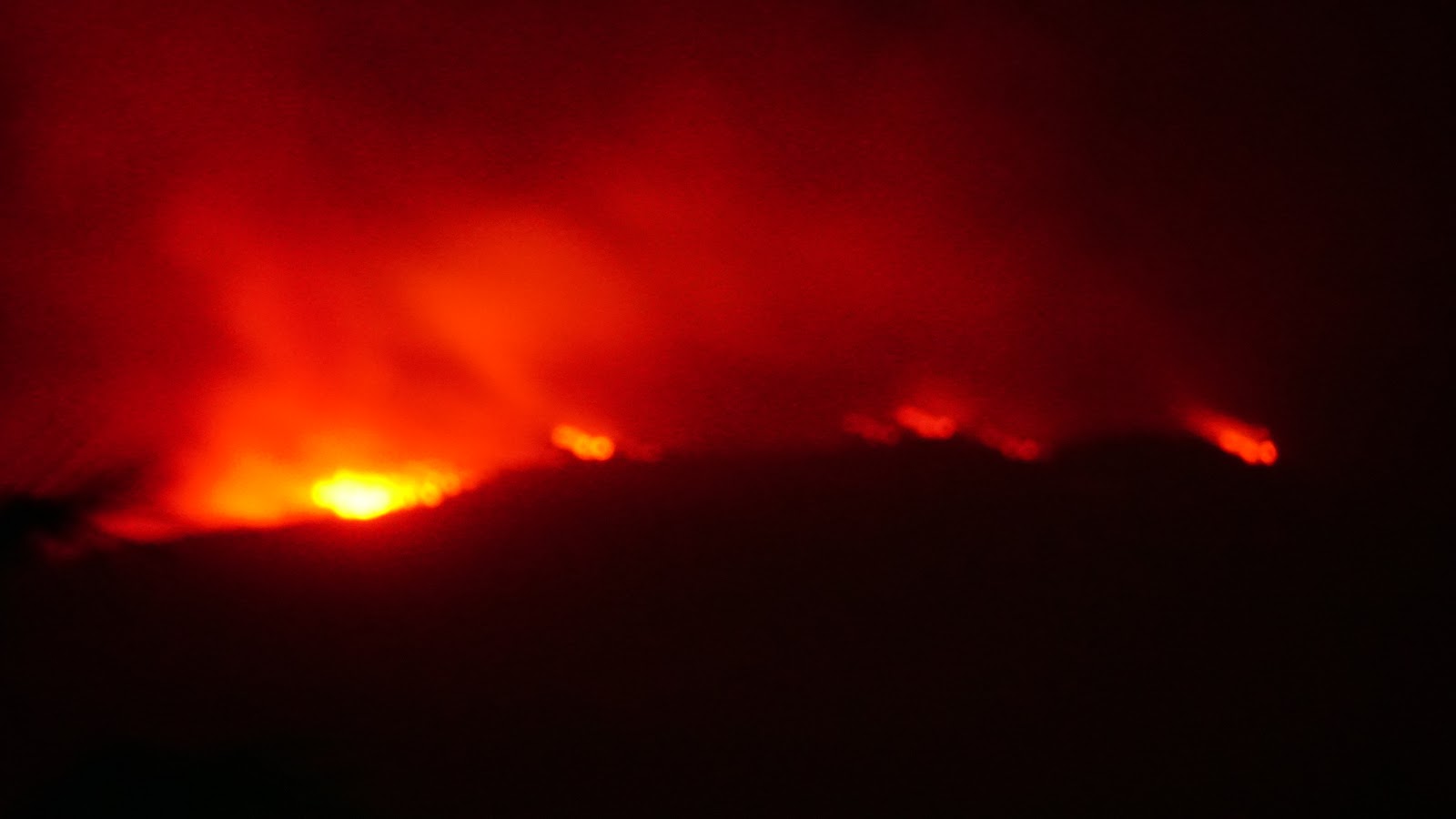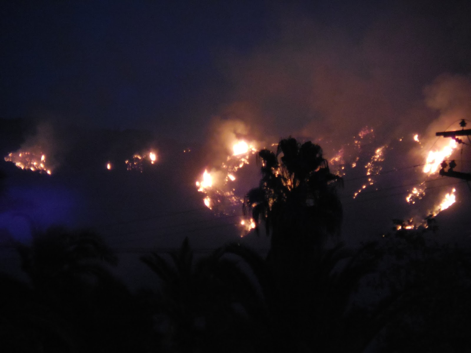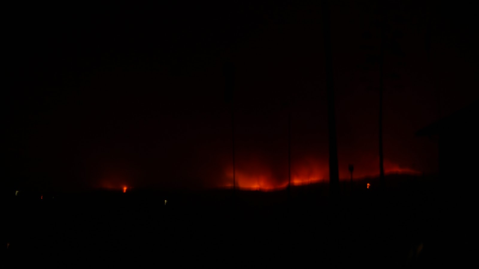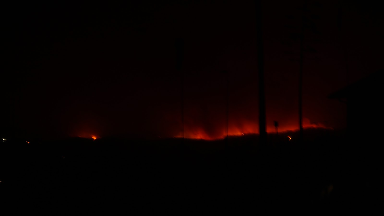 A wall of fire tonight 12 miles long, heading our way. Sorry for the shaky picture, shot it freehand in dense smoke. |