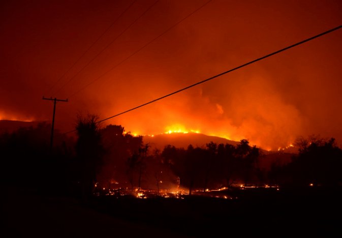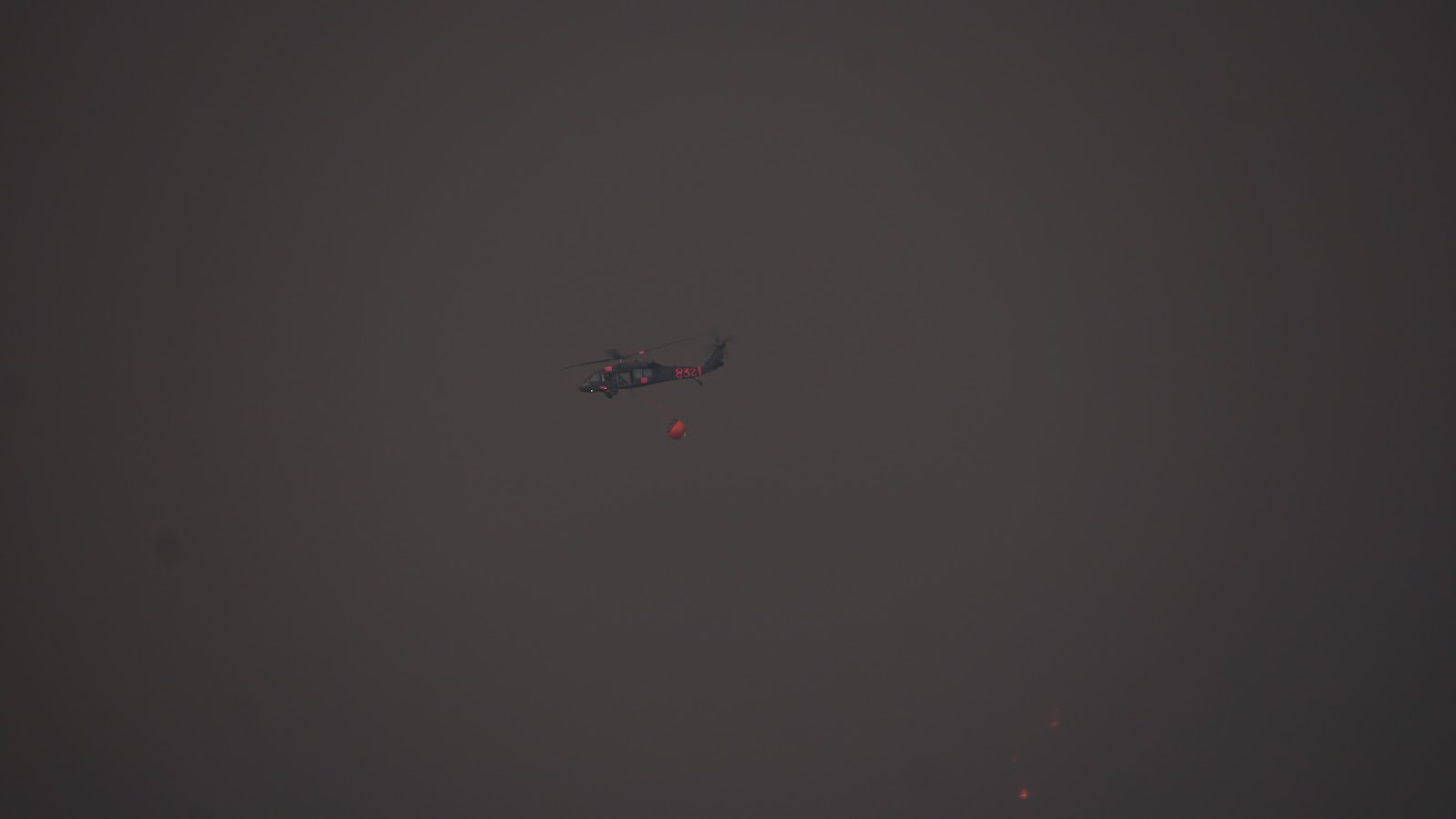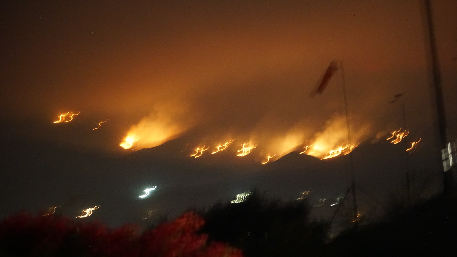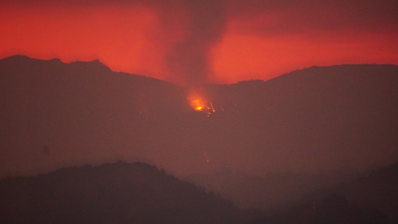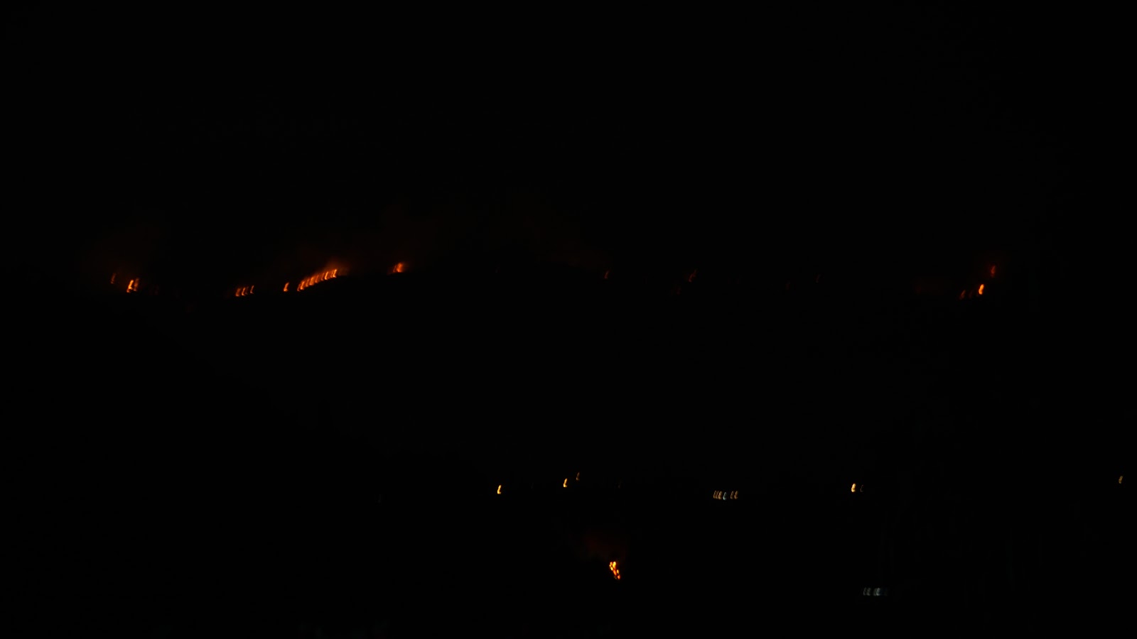 A wall of fire tonight 12 miles long, heading our way. Sorry for the shaky picture, shot it freehand in dense smoke. |