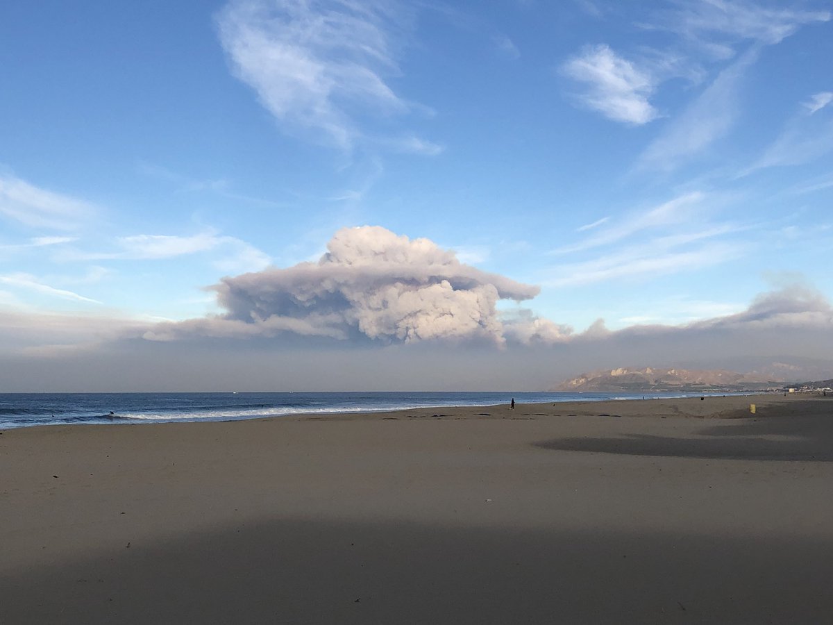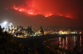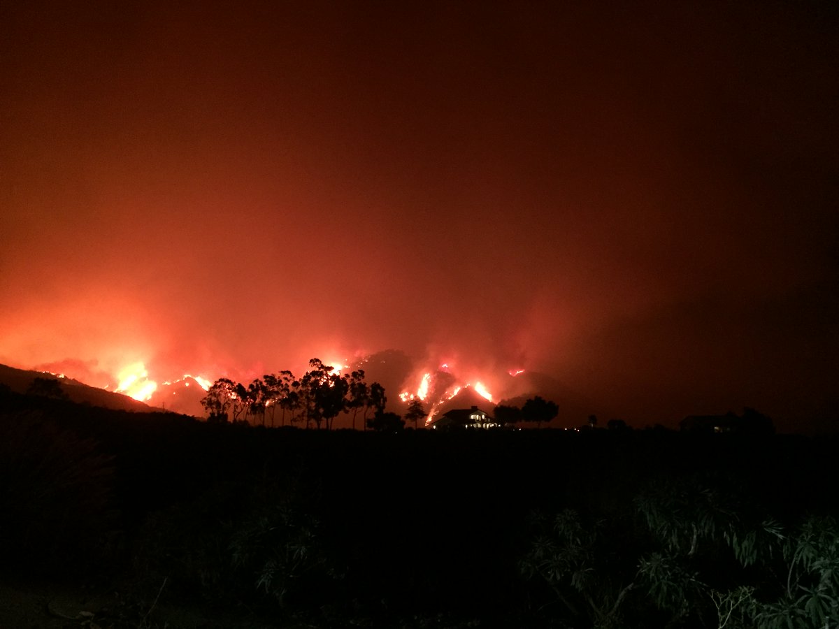 This is actually a wall of fire coming down from wheeler springs and now, they say, Meiner’s Oaks is burning in River bottom. THe entire ocean range from main street ventura to Summerland is now gone. so much for a nice place to live or is that the point? |