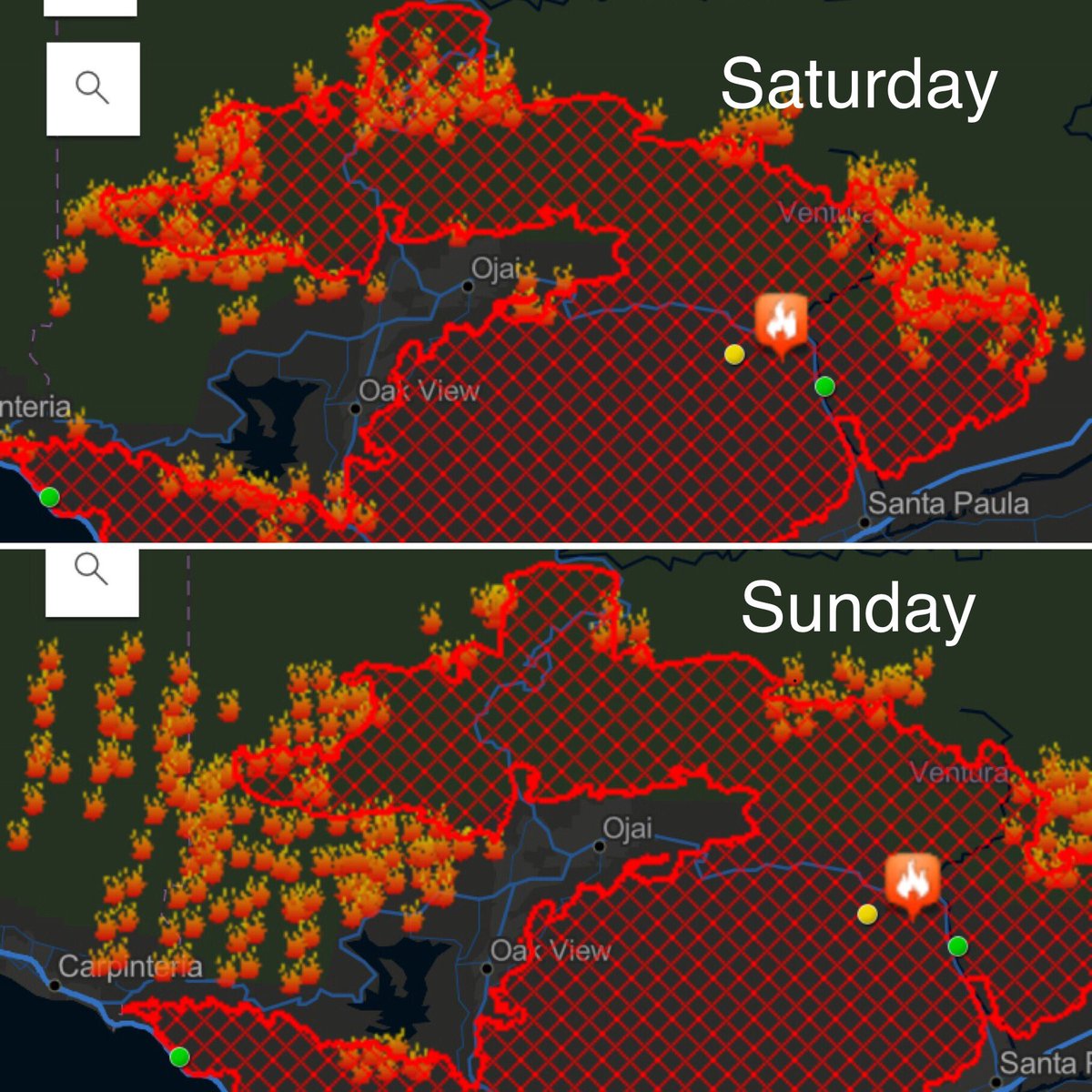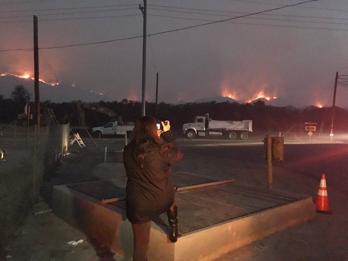 sunrise Tuesday morning, no firetrucks anywhere and we WERE EVERYWHERE the fire was. Taken from Ojai ave 6am,on our way to get someone out of an area that was burning. We came across police roadblocks, so we have to take dirt roads behind the regular roads and as we got near our destination, yet another sheriff stopped us, telling us everyone behind had been evacuated. We informed his that was impossible, as we had just spoken to the lady, who was 300 yards from his roadblock. He let us through, and then ALL OF US, found our cell phones had been disabled after that and we could not call or message anyone. |