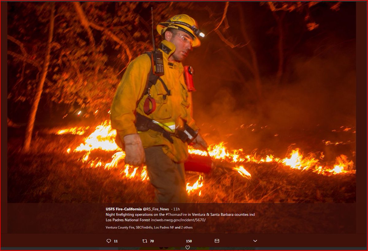 I know all this because I live in the middle of all this and have spent all week doing rescues, evacuating, and watching fires roar through the mountains that ring Ojai Valley without any planes, helicopters, or fire fighting personnel or equipment anywhere to be seen. ALL week, except for one small enclave where EX POLICE, FIREMEN, AND FEDERAL AGENTS LIVE IN RETIREMENT. THAT ONE LITTLE AREA GOT ALL THE EQUIPMENT AND ALL THE PRISON LABOR TO DO THE ACTUAL FIRE FIGHTING THAT OUR WAY OVERPAID FIREMEN NEVER DO, BECAUSE IT IS SO DANGEROUS. That enclave on Encino road was protected, but everywhere else from Fillmore to the ocean and from the Los Padres national forest to Carpenteria was just left to burn.